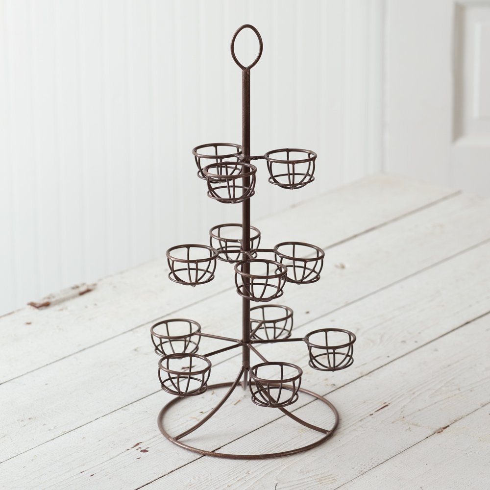 Use our vintage egg tree stand to display your farm fresh eggs or to dye eggs for Easter. It is fashioned of metal and has a hook on top to easily transport for an event.